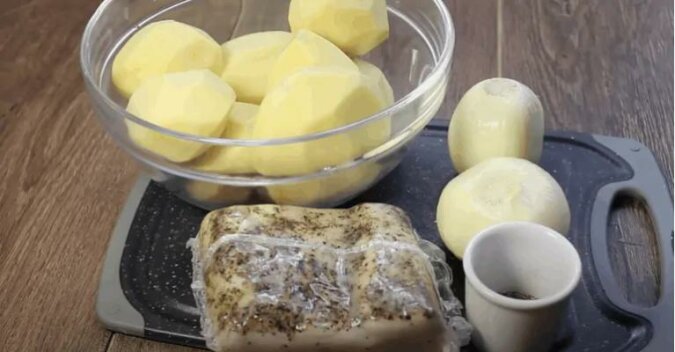 Potrzebne będą: ziemniaki, smalec, cebula, trochę oleju roślinnego, kilka pasków boczku, zioła.