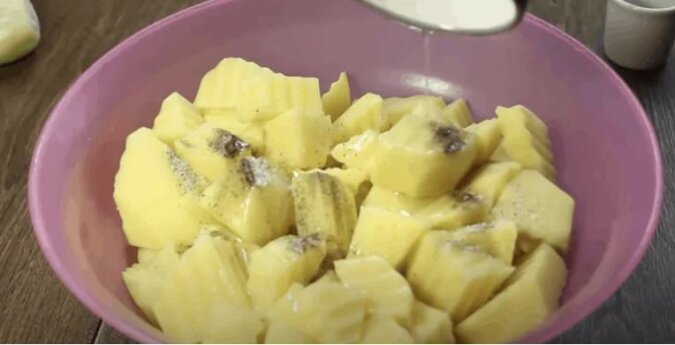Obierz ziemniaki i pokrój na małe kostki, dopraw ulubionymi przyprawami i 1 łyżką oleju.