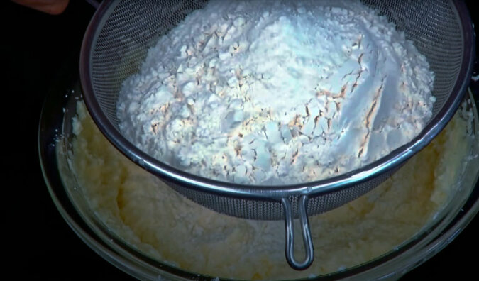 Krok 10. Przesiej mąkę z proszkiem do pieczenia do pozostałych składników.
