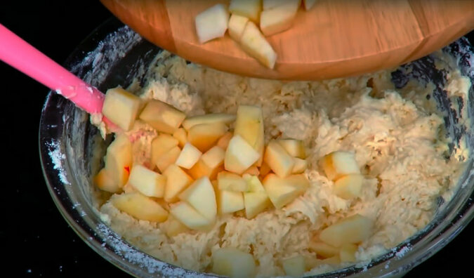 Krok 12. Dodaj do ciasta pokrojone jabłka bez skórki. Wymieszaj.