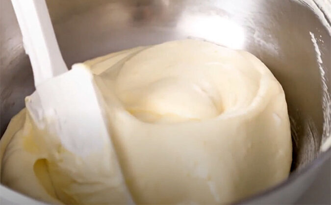 Połącz białko z ciastem, następnie delikatnie wsyp cukier i wymieszaj.
