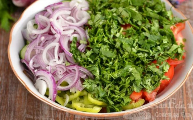 Cebulę można wziąć zwykłą lub czerwoną i pokroić w cienkie półpierścienie.