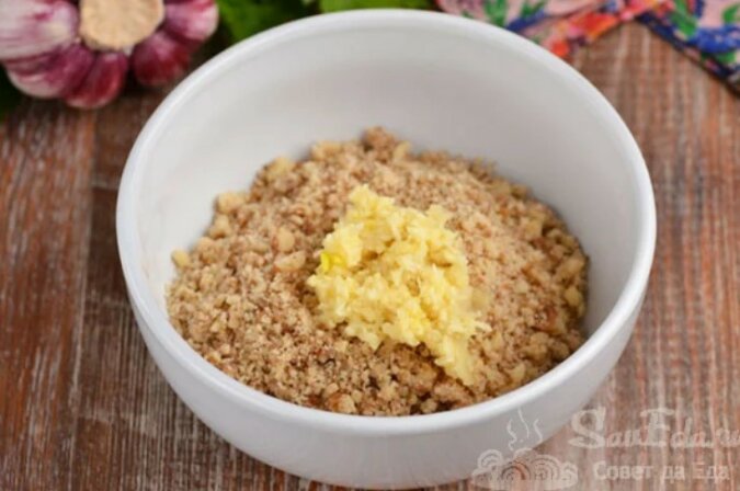 Do dressingu zmiel orzechy i czosnek blenderem. Jeśli nie ma blendera pokrusz orzechy wałkiem do ciasta, a czosnek posiekaj drobno lub zetrzyj na tarce.