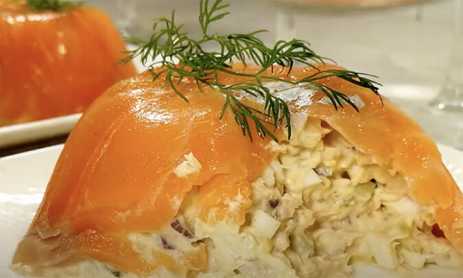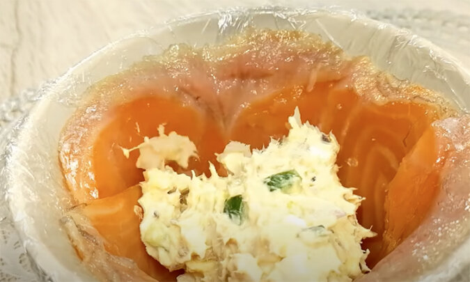 Przykryj małe miseczki folią spożywczą. Ułóż warstwę łososia. Wypełnij nadzieniem, przykryj folią i pozostaw w lodówce na 2 godziny.