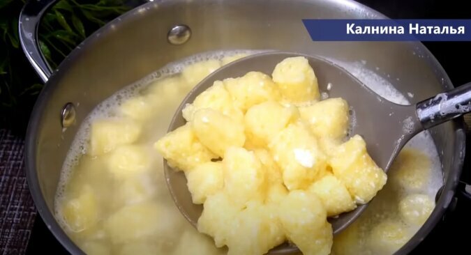 Nalewamy wodę do garnka, solimy. Zamiast wody można użyć mleka. Kiedy woda się zagotuje, wyciskamy ciasto i odkrajamy małe kawałki.