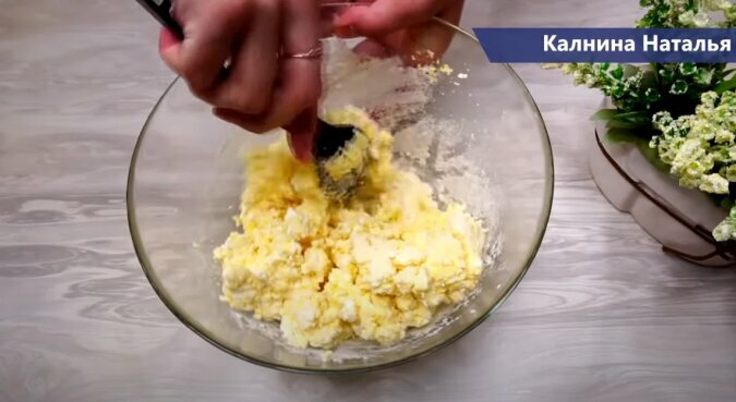 Kładziemy 400 g twarogu do miski, dodajemy 1 jajko, 1/3 łyżeczki soli, 1-2 łyżki cukru. Mieszamy.
