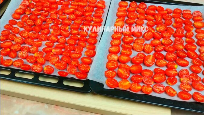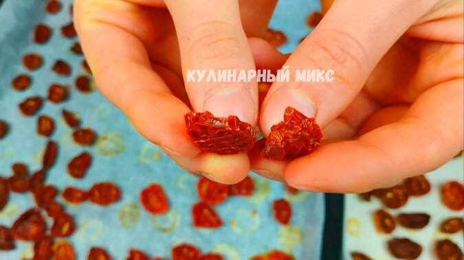Wyjmuję pomidory, są całkowicie wysuszone, cała wilgoć z nich wyparowała i tak powinno być! Po ostygnięciu pomidorów, jeśli skosztujesz jednego kęsa, będą smakować jak chipsy pomidorowe!