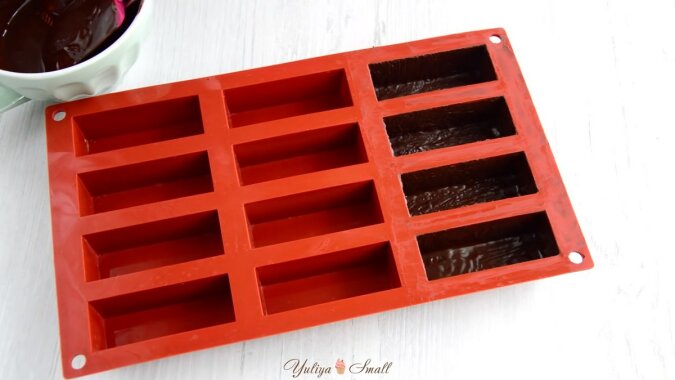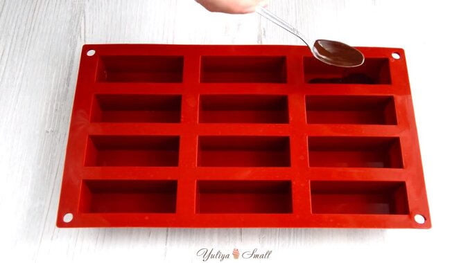 Wlej niewielką ilość czekolady do każdej komórki i rozprowadź ją po dnie i bokach za pomocą pędzelka. Następnie umieść formę w zamrażarce na kilka minut.