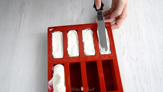Weź tę samą silikonową formę i natychmiast wypełnij komórki masą twarogową do pełna.