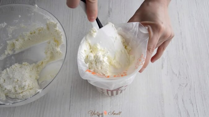 Do twarogu dodaj cukier puder, roztopione masło i cukier waniliowy. Jeśli twaróg jest grudkowaty, najpierw należy go przetrzeć przez drobne sito lub tarkę. Lepiej jest użyć miękki twaróg.