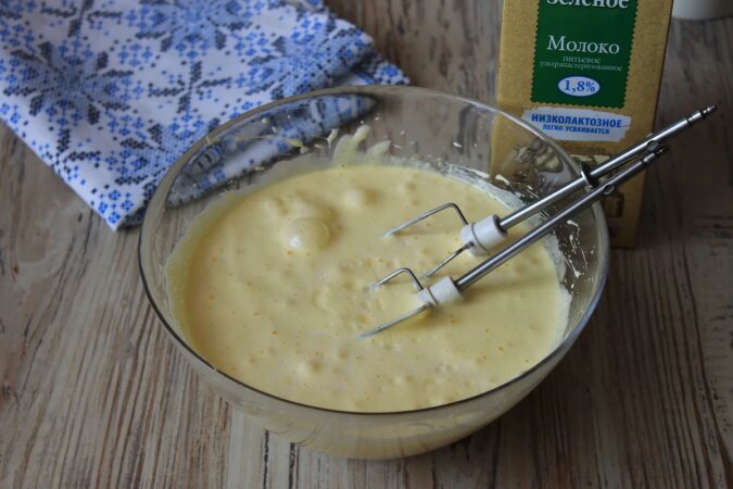 Następnie wlej mleko, olej roślinny i wymieszaj.