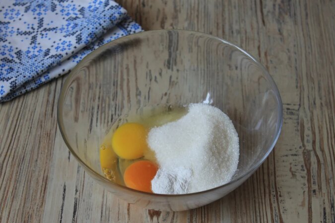 Przede wszystkim rozbij jajka do miski, dodaj cukier, szczyptę soli i cukier waniliowy...