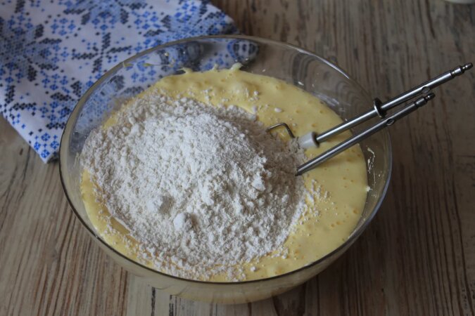 Mąkę przesiej razem z proszkiem do pieczenia, wymieszaj. Otrzymamy dość płynne ciasto biszkoptowe.