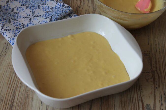 Teraz bierzemy dowolną formę do pieczenia (wielkość mojej formy to 20 na 20 cm) - smarujemy masłem, posypujemy mąką i wlewamy połowę przygotowanego ciasta.