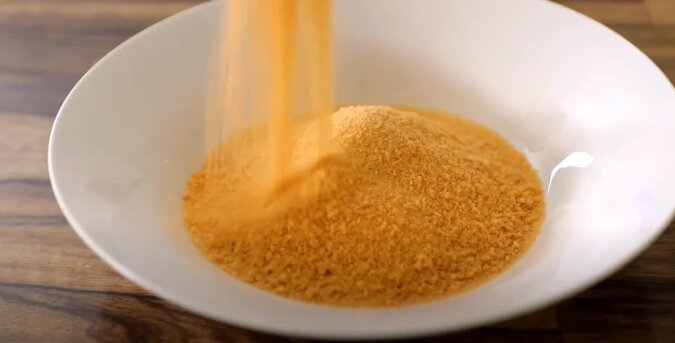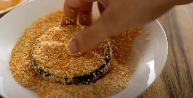 Następnie przenosimy je do mieszanki bułki tartej i sezamu.