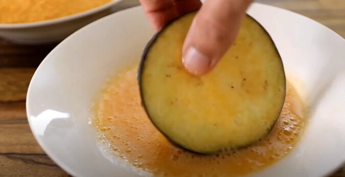 Zanurz krążki bakłażana w ubitych jajach jeden po drugim.