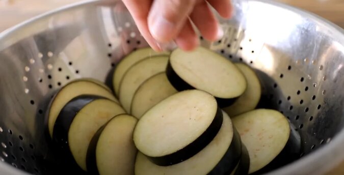 1-2 bakłażany pokrój w plasterki i posól do smaku. Pozostaw na 15 minut, aby usunąć gorycz i nadmiar wilgoci.