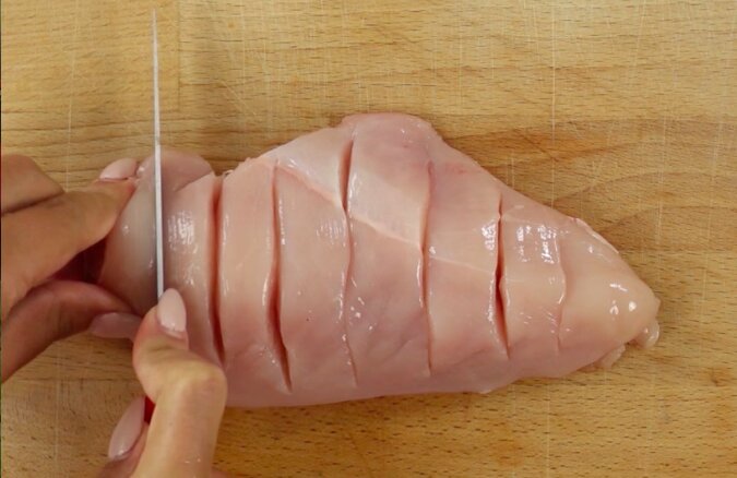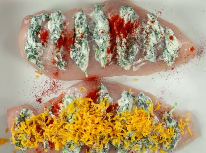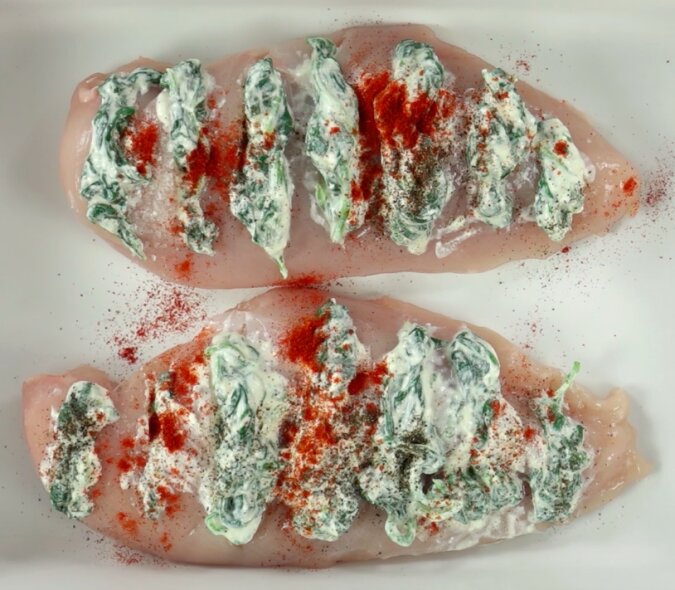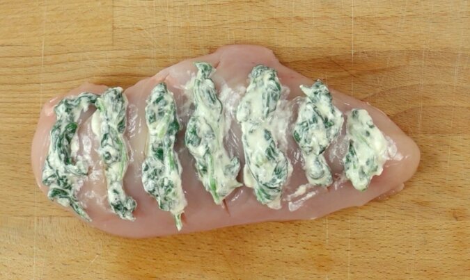 Każdą pierś z kurczaka natnij w kilku miejscach – w powstałe szczeliny wciskaj farsz serowo-szpinakowy.