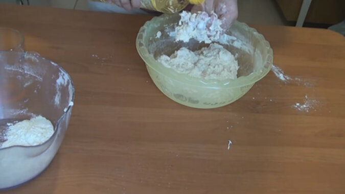 Gdy ciasto zacznie tworzyć kształt, wlej 2 łyżki oleju roślinnego i ugniataj ciasto. Powinno być miękkie i lekko lepkie do dłoni.