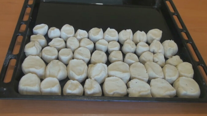 Z kawałka ciasta uformuj rulonik i pokrój na kawałki. Blachę do pieczenia posmaruj masłem lub przykryj papierem do pieczenia, rozłóż balabuszki i odstaw na 10 minut. Piecz w piekarniku nagrzanym do 200 stopni przez 20 minut.