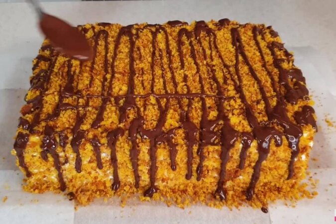 Teraz gotowe warstwy ciasta należy przekroić na pół. Nożem obcinamy brzegi ciasta, aby były równie, a następnie mielimy na okruchy. Jedną warstwę ciasta smarujemy kremem, a następną kładziemy na wierzchu. Ponownie smarujemy go kremem, a także smarujemy kremem boki ciasta. Na koniec, deser posypujemy okruchami z brzegów ciasta. Ciasto można również polać czekoladą rozpuszczoną w kąpieli wodnej. Po wykonaniu tych czynności ciasto chłodzimy w lodówce przez kilka godzin. Ciasto marchewkowe jest gotowe! Życzymy wszystkim smacznego!