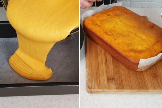 Blaszkę wykładamy papierem do pieczenia, a zatem wlewamy ciasto. Piekarnik rozgrzewamy do 180 stopni Celsjusza, formę wstawiamy do piekarnika i pieczemy przez około 45 minut. Po upływie tego czasu gotowość ciasta do wyjęcia sprawdamy wykałaczką. Nawiasem mówiąc, jeśli zauważysz, że środek ciasta podniósł się podczas pieczenia, nie martw się. Po całkowitym ostygnięciu, powierzchnia ciasta zostanie wyrównana.