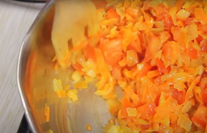 Zetrzyj marchewkę na grubej tarce i pokrój cebulę w kostkę. Podsmaż cebulę i marchewkę do miękkości w rondelku z 3 łyżkami oleju roślinnego, w którym ugotujesz zupę.