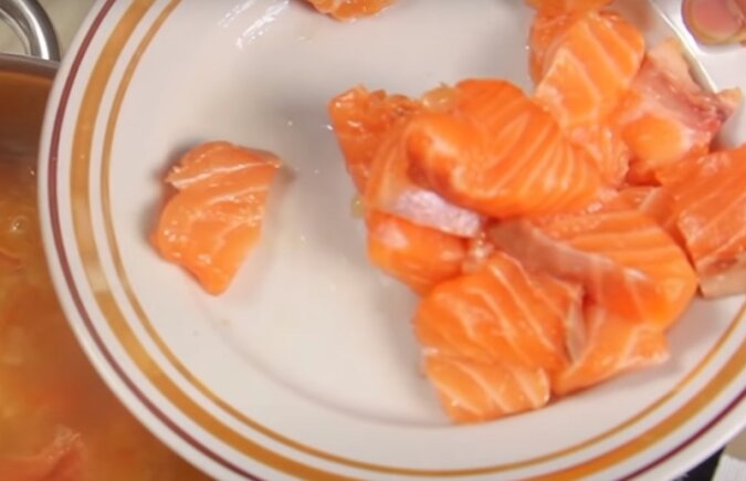 Gotuj zupę przez 15 minut, a następnie dodaj do garnka łososia, pokrojonego w średnie kawałki (możesz użyć inną rybę). Wymieszaj zupę i dodaj suszone lub świeże posiekane zioła.