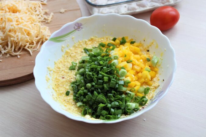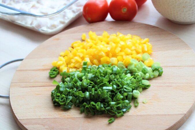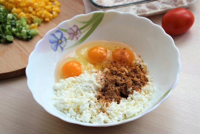 Aby to zrobić, pokrój małą paprykę i szczypiorek na małe kostki. W salaterce wymieszaj 200 g twarogu (może to być twaróg o niskiej zawartości tłuszczu), 4 jajka, dodaj sól i przyprawy.