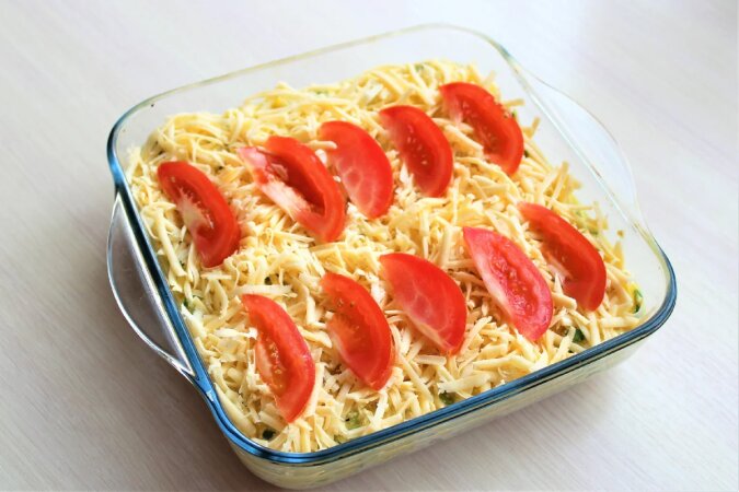 I na koniec: posyp tarty ser na wierzch zapiekanki, a na górze ułóż pomidor pokrojony w plasterki.