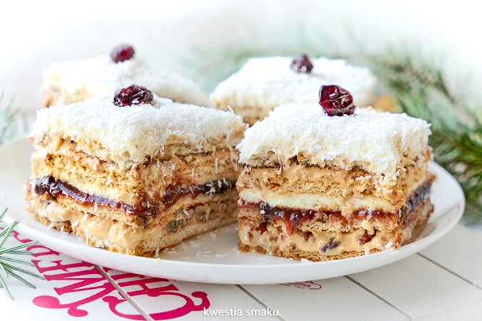 Dno formy o wymiarach 21x32 cm wykładamy papierem do pieczenia i wykładamy na niego warstwę herbatników. Połowę masy krówkowej łączymy z orzechami i rozsmarowujemy po herbatnikach. Znów układamy warstwę herbatników, na nich kładziemy powidła, które posypujemy połową przyprawy piernikowej. Trzecią warstwę herbatników okładamy resztą masy krówkowej i posypujemy resztą przyprawy piernikowej. Układamy ostatnią warstwę herbatników, a całość pokrywamy warstwą masy budyniowej. Wierzch posypujemy wiórkami kokosowymi. Ciasto wstawiamy do lodówki, najlepiej na całą noc.