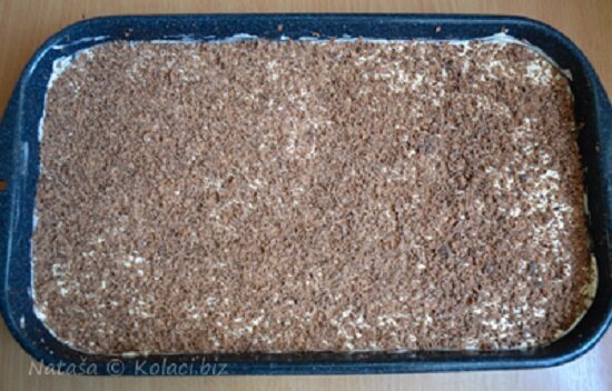 Na tak wyłożone herbatniki wylej masę i delikatnie wygładź wierzch i wyrównaj brzegi. Całość obficie posyp startą czekoladą i włóż do lodówki, najlepiej na całą noc.
