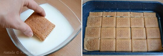 W pozostałym mleku delikatnie zanurzaj herbatniki i układaj je na dnie formy.