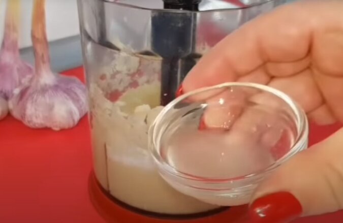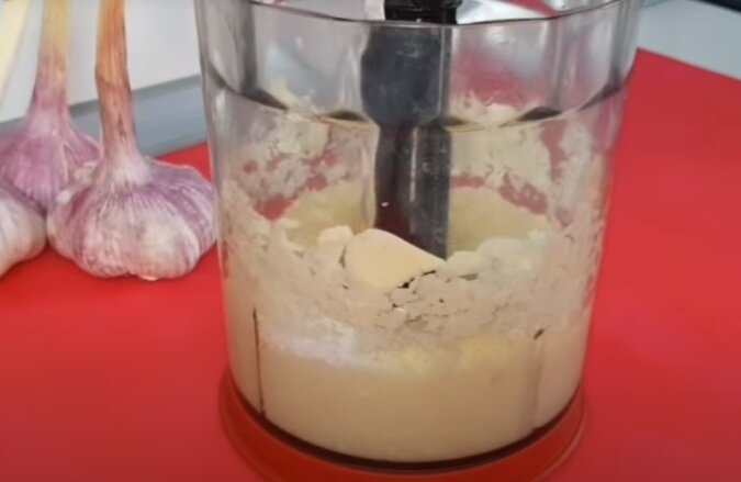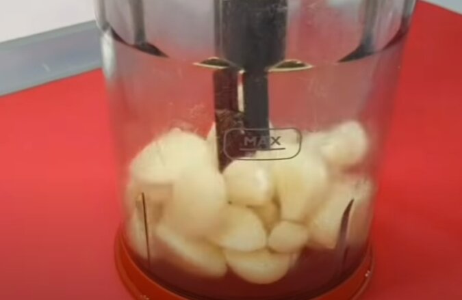 Czosnek należy obrać, a następnie zblendować przy pomocy blendera. Niestety, maszynka do mielenia mięsa nie nadaje się do tego, ponieważ mielienie jest zbyt grube. Natomiast konsystencja pasty powinna być jednorodna.