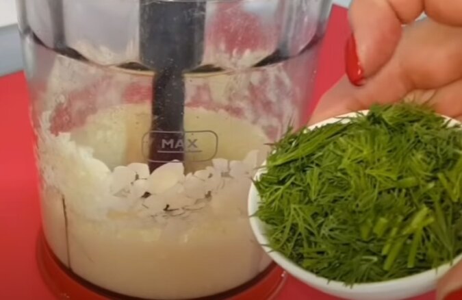 Koperek należy posiekać, a następnie połączyć z czosnkiem. Do blendera wsypujemy także sól, 1 łyżkę octu, a także 30 ml oleju roślinnego. Pastę czosnkową należy zblędować razem z ziołami, aż do uzyskanie jednorodnej konsystencji.