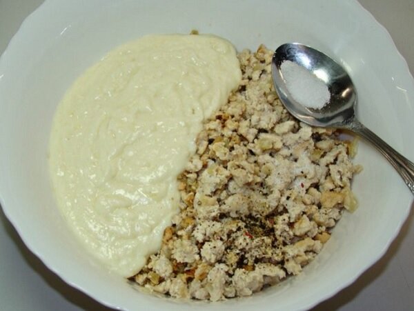 4. Zrób sos beszamelowy, wymieszaj z mięsem mielonym, solą i czarnym pieprzem.