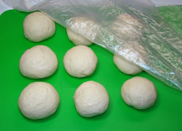 5. Ciasto podziel na 9 części. Z każdej części zwiń kulkę, połóż na desce do krojenia i przykryj folią spożywczą. Ciasto odstaw na 15 minut.