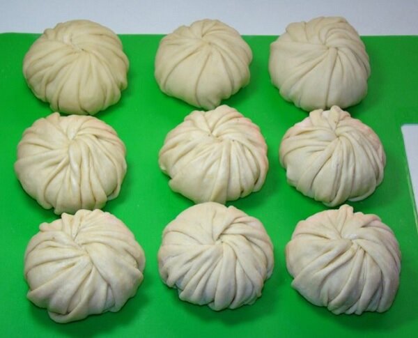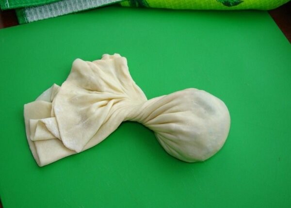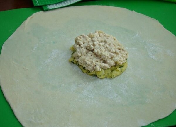7. Umieść 1 łyżkę puree i 1 łyżkę nadzienia mięsnego na środku. Zbierz brzegi ciasta w pęczek. Przekręć powstały „ogon”, otwórz krawędzie i uformuj samsę.