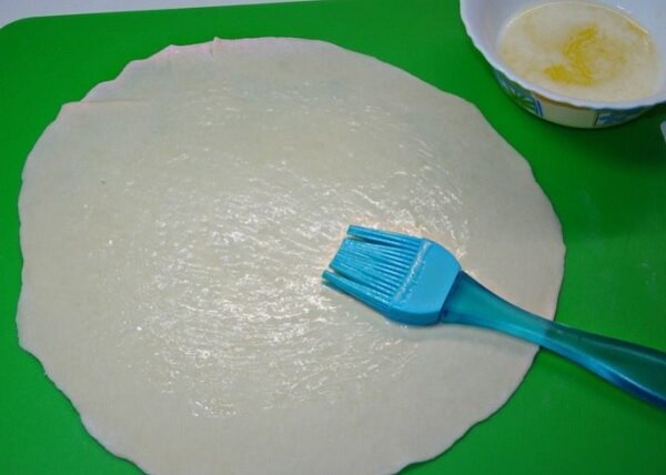 6. Po posypaniu kulki ciasta skrobią kukurydzianą i mąką rozwałkuj ją w cienką warstwę. Za pomocą silikonowego pędzelka rozprowadź roztopione masło na środku ciasta. Odwróć ciasto natłuszczoną stroną do dołu.