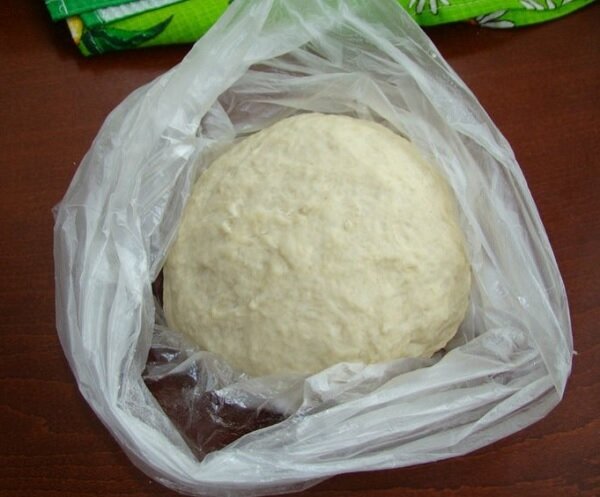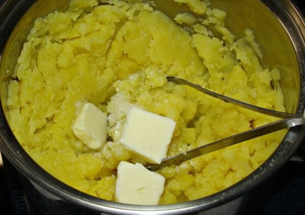 2. Ciasto zawinąć w folię lub worek. W międzyczasie obrane ziemniaki ugotuj, stłucz na puree z 50 g masła, dodaj posiekany koperek i wszystko dobrze wymieszaj.