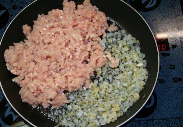 3. Cebulę posiekaj i podsmaż, aż się zeszkli, ułóż na patelni mieloną wołowinę, wszystko dobrze wymieszaj i smaż mięso do miękkości.