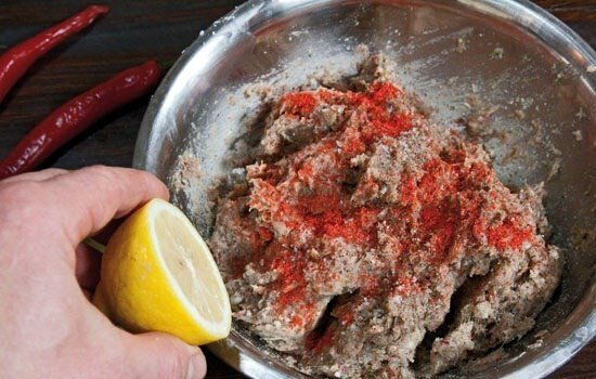 Zmiel wszystko, aż do jednolitości. Dobrze wymieszaj rękami (potrzeba kilku minut). Dodaj sól i przyprawy do smaku. Skrop sokiem z cytryny. Ponownie wymieszaj farsz.