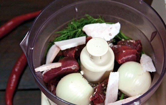 Umyte i wysuszone mięso pokrój na duże kawałki. Obierz i pokrój cebulę na kawałki. Cebulę, mięso i boczek włóż do blendera i ubij. Możesz też wszystko przepuścić przez maszynkę do mięsa. W razie potrzeby dodaj trochę świeżych ziół do mięsa mielonego.