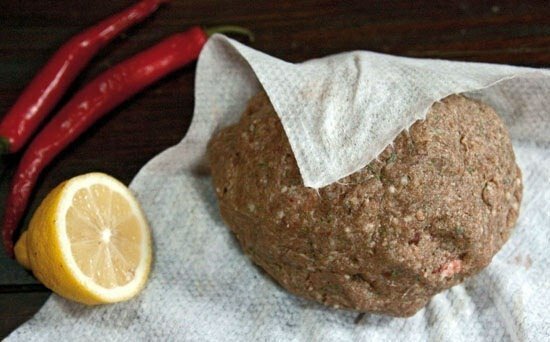 Potrzebujemy małego kawałka czystej, cienkiej szmatki. Z mielonego mięsa formujemy kulkę i zawijamy ją w szmatkę, aby nadmiar wilgoci, jeśli w ogóle jest, zniknął.