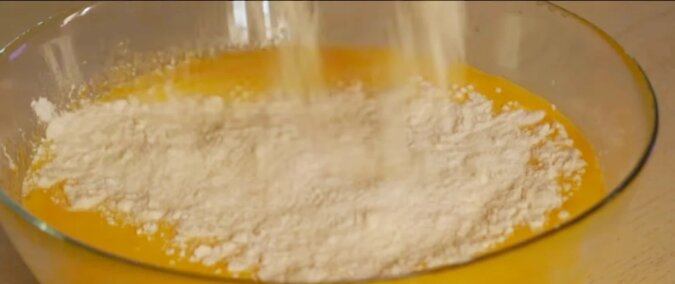 Mąkę przesiej do tej samej miski i za pomocą blendera ubij na lekkie ciasto.