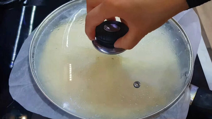 Gdy wierzch będzie zwarty, umieść kawałek pergaminu między patelnią a pokrywką. Następnie przykryj patelnię i jeszcze trochę „smaż”.