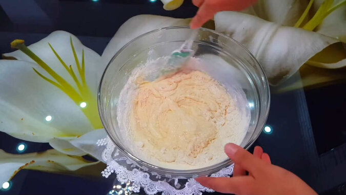 Połącz jajko, sól i 60 g cukru. Dodaj kefir i olej roślinny, mieszaj do uzyskania jednolitości. Mąkę i proszek do pieczenia przesiej, dodaj ocet jabłkowy i wymieszaj ciasto.