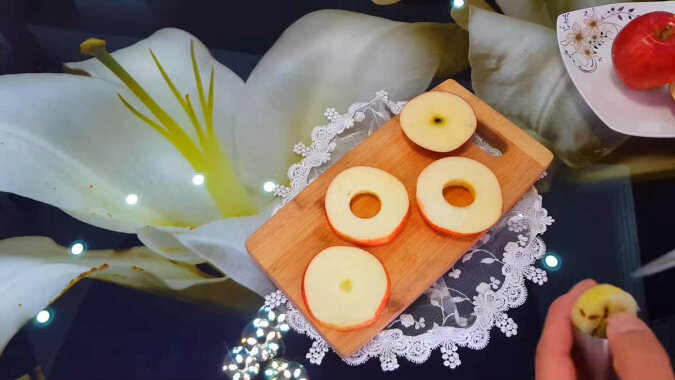 W przekroju ciasto jabłkowe okazuje się niesamowicie piękne. Plasterki owoców świetnie pieczą się na patelni, więc nie bój się chrupiącej niespodzianki. W razie potrzeby posyp jabłka cynamonem - wszyscy szaleją na punkcie tego połączenia! Wierzch możesz udekorować plasterkami świeżych jabłek, śmietanką lub lodami.