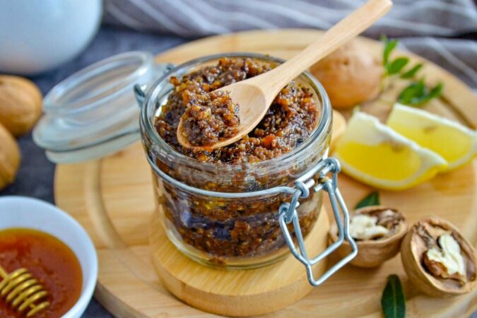 Mieszankę suszonych owoców doprawia się znanymi lekarstwami na przeziębienie - miodem i cytryną. Musi również zawierać orzechy włoskie, które są bogate w jod i zdrowe tłuszcze. W oryginalnej recepturze brakuje tylko imbiru do dopełnienia obrazu (wówczas nie był on u nas zbyt popularny). Zalecamy dodanie go również.