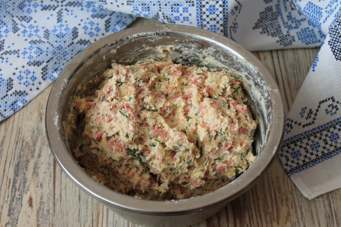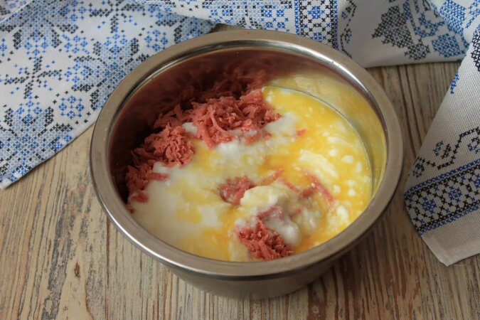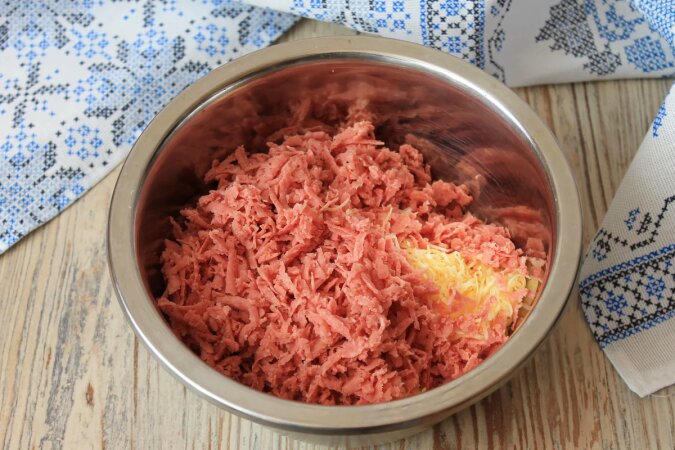 Następnie na grubej tarce zetrzyj wędzoną kiełbasę do miski z serem.